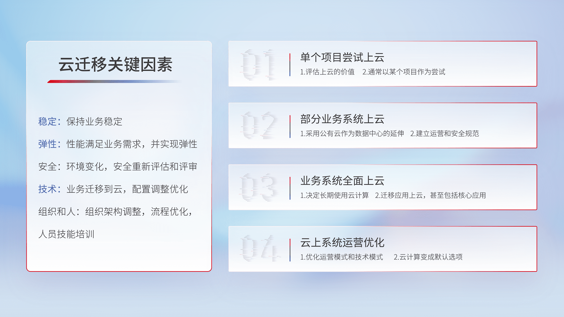 结合实际业务,,从规划设计、、、、云平台选型、、云原生改造、、、数据迁移、、集成交付,,,,迁移全过程为客户识别最佳上云路径,,做好风险识别管理,,,,设计网络架构、、、身份权限、、、、安全审计合规、、、、操作审计、、、、日志审计、、监控告警策略、、、多站点容灾设计等,,对云上基础设施进行整体规划,,,提升IT治理水平,,,以满足弹性、、高可用、、、高性能的需求。。