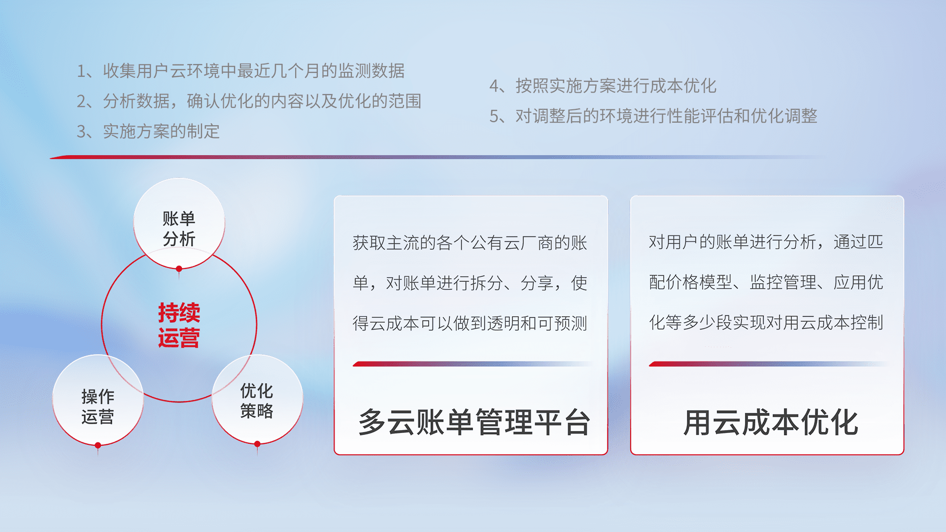 通过多云纳管,,以统一的资源数据模型把客户的云资源进行抽象和封装,,,进而实现对多云资源的统一操作,,,保障云资源管理的可靠性、、稳定性与可用性。。。量身定制化运维内容,,,配置、、、、开发运维、、、补丁管理、、、、备份、、、、监控、、、认证和访问管理、、、审计和日常巡检等,,,保障在用云过程中的可靠度,,,稳定度以及高可用率。。。